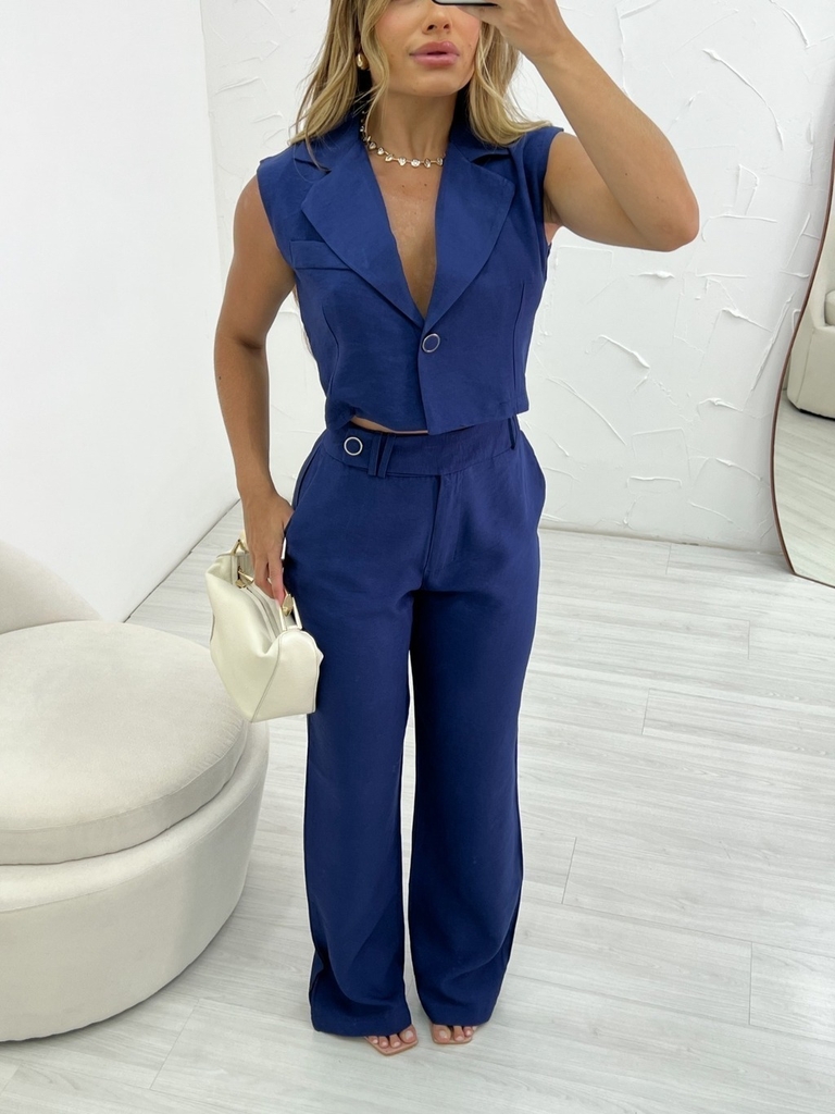 Com colete de manguinha e calça pantalona, esse conjunto é a definição de charme moderno. Ideal para quem ama se vestir bem sem abrir mão do conforto.
