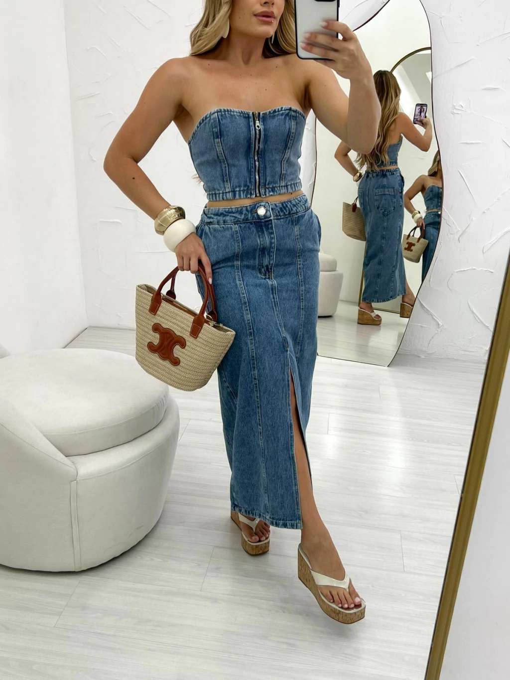 Arrase com o Conjunto Jeans Saia e Cropped e sinta-se linda, confortável e confiante em qualquer ocasião!